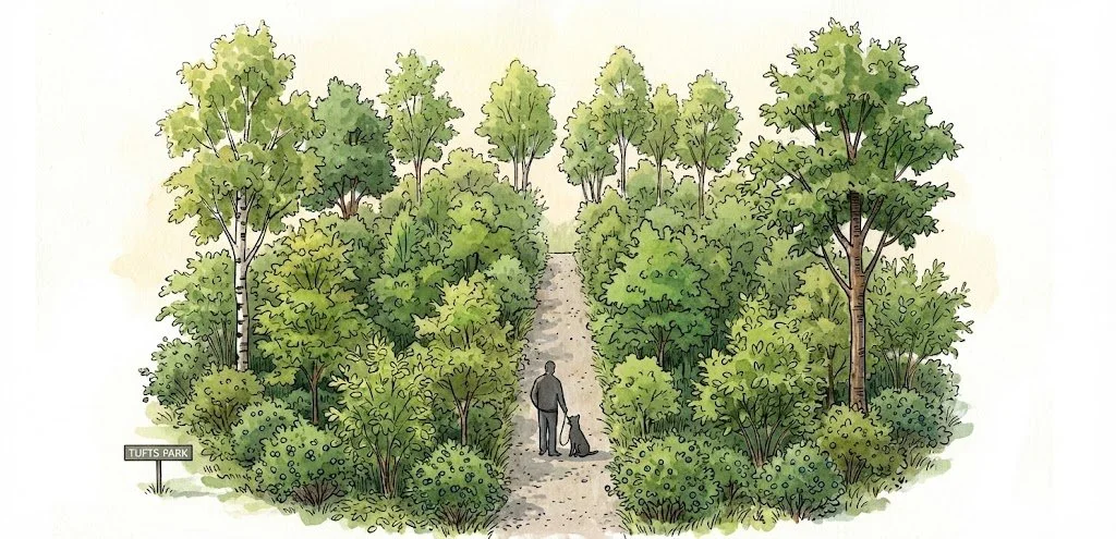 During the meeting we also acknowledged something many people care about: Tufts Park is used in many ways, including an area nearby where off-leash dogs often play. This mini-forest is not intended to “take over the park.” The goal is coexistence: a protected young planting that will grow into a thriving pocket of habitat while the park remains a shared space for everyone.